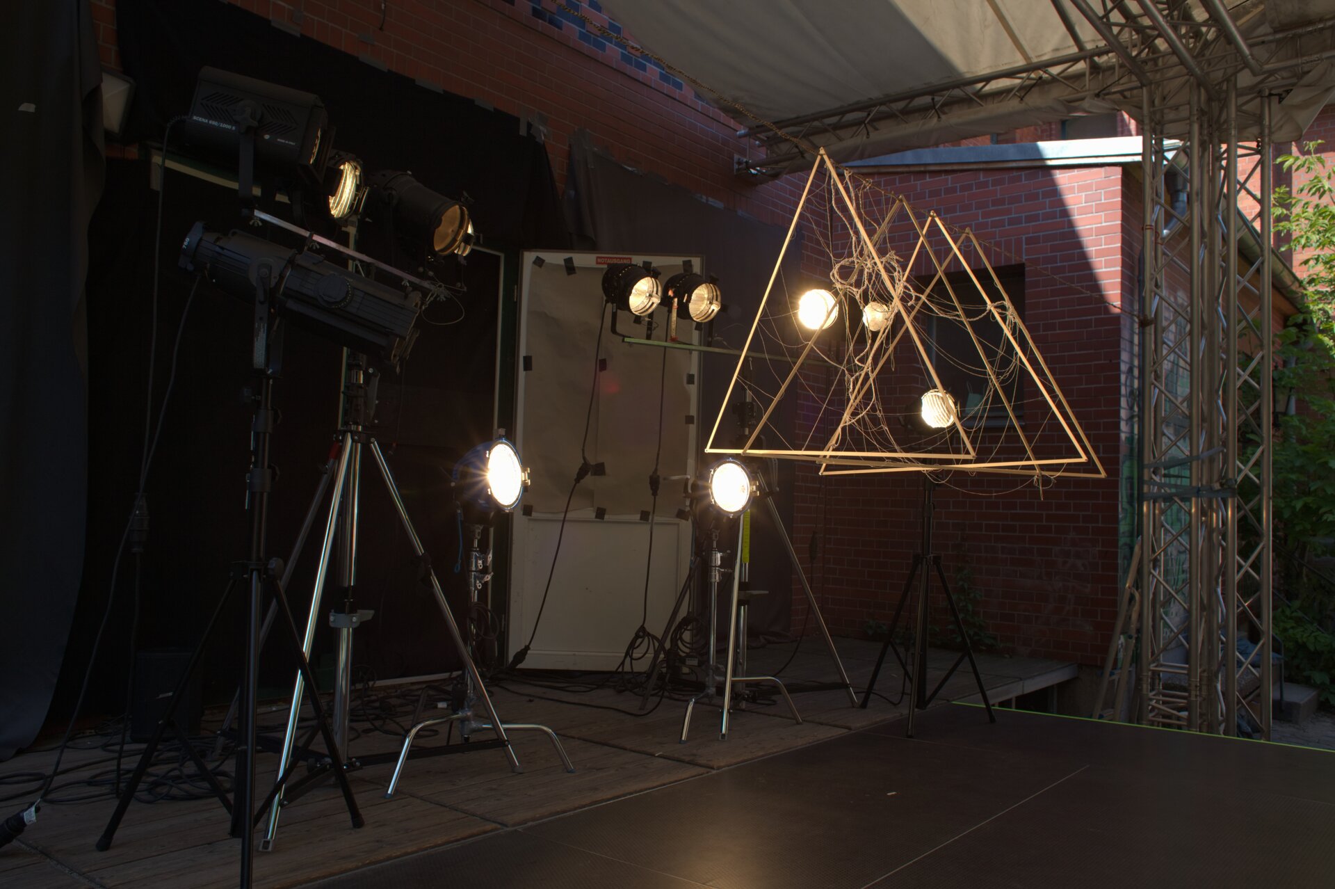 Finally, with the linden strips, I built four triangles. They are the faces of a tetrahedron, the geometric structure that could remind one of the spongy bone of the jaw and the lighting trusses where I hung the artwork.