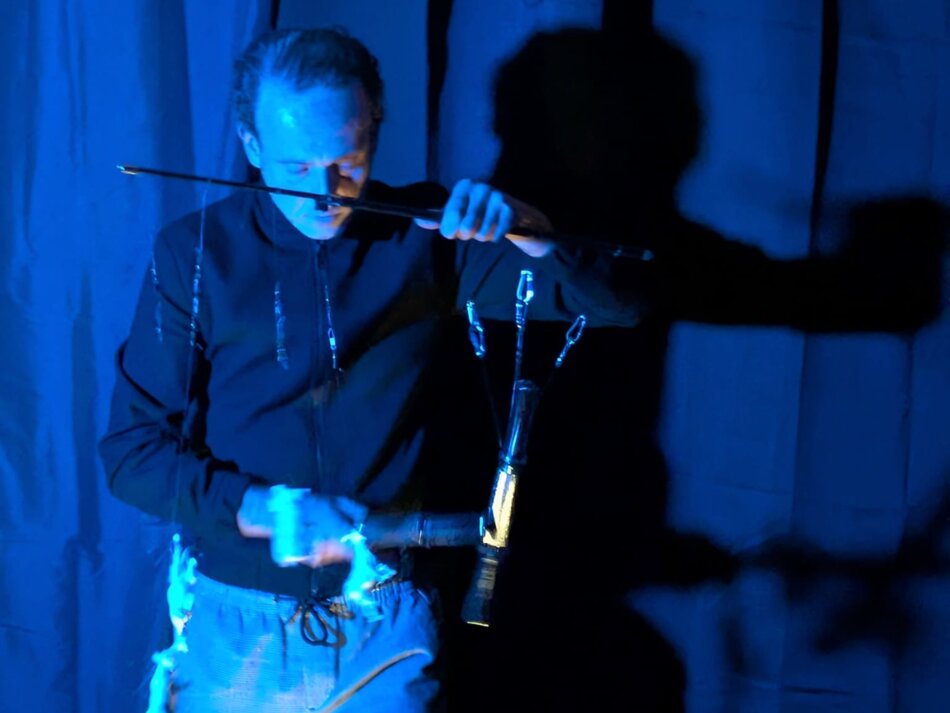 Things used on stage (not part of the artwork itself): steel dumbbell bars 35×28 centimeters / 13.8×11 inches, found things (plastic animal figures), water-based strong-adhesion acrylic paint, aluminium bankstick 80 centimeters / 31.5 inches, barrel swivels with snaps (gunmetal finish), green monofilament fishing line 0.50 millimeters / 0.020 inches, steel carabiner hooks.
